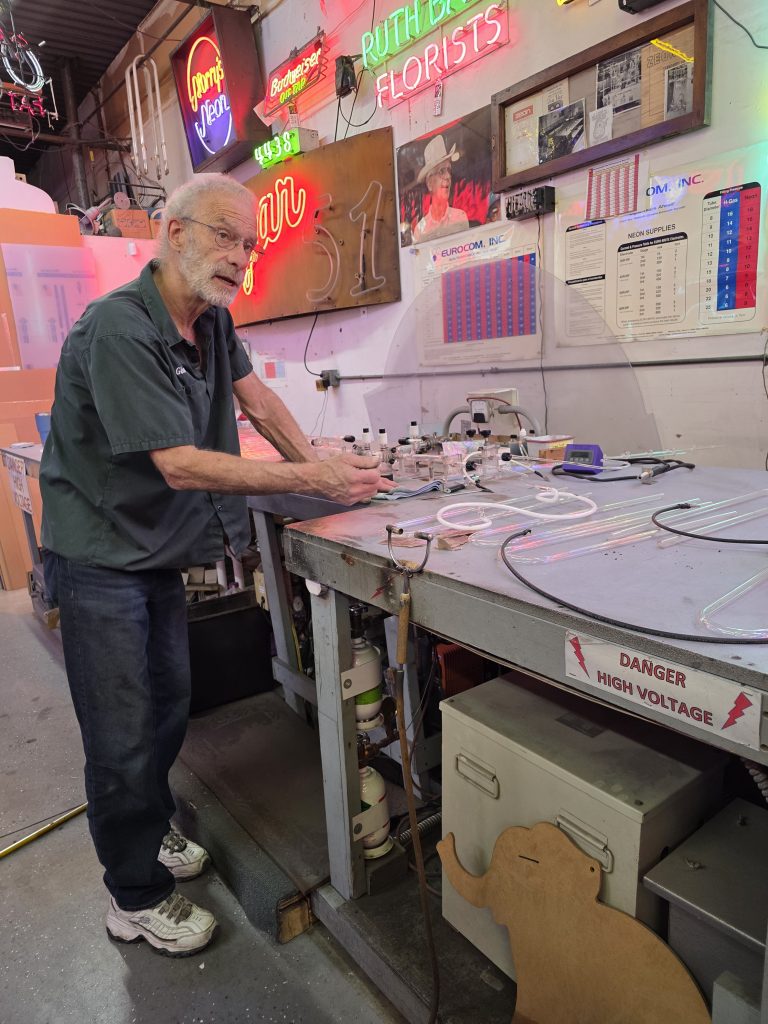 Once you’ve watched glass bend over a flame, roadside neon stops being wallpaper. That vintage motel sign buzzing on Route 66, the old diner arrow pointing you toward pie — someone bent that by hand, tube by tube, over a paper pattern on a workbench. Every curve was calculated. Every color was chemistry.